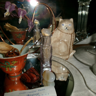 The definition of an alter is "a platform or table used as a center of worship", which is a very good explanation of what it is. I first heard of an alter from a friend's mom, while visiting her she mentioned she had one and used it to send good fortune to her real-estate clients. I had never heard of an alter before so I was intrigued so she showed me. Her alter was upstairs in her guest bedroom, on a small table. There was a buddha figurine, sage, candles, and lots of little rocks, shells, and other objects that were small. The small objects were all assigned to people, some were little figurines of animals, or person adjecent things, but like I said before some were rocks and shells. All of the figurines, objects, and candles sat on a cloth. She explained that a cloth was essential, and that all of the objects should be on the cloth. She was very adament about there being no "rules" when it came to making my own, it was more important to follow my intuition about what I felt should be there and what shouldn't. There is also no guide as to who or what you will worship on your alter, that is completely up to you. The objects can even be whatever you would like, some bigger than others if you wanted, as long as they fit on your cloth. Feathers, rocks, shells, flowers, and any sort of natural material is great, as well as little porcelin figurines or trinkets of any kind. To start me off she gave me a cloth which was an old placemat of hers, and also a round cloth with embroidery and told me to use which ever one felt right.